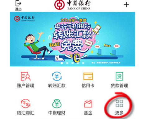 第一步:登陸中國銀行手機銀行,在手機頁面右側找到“更多”